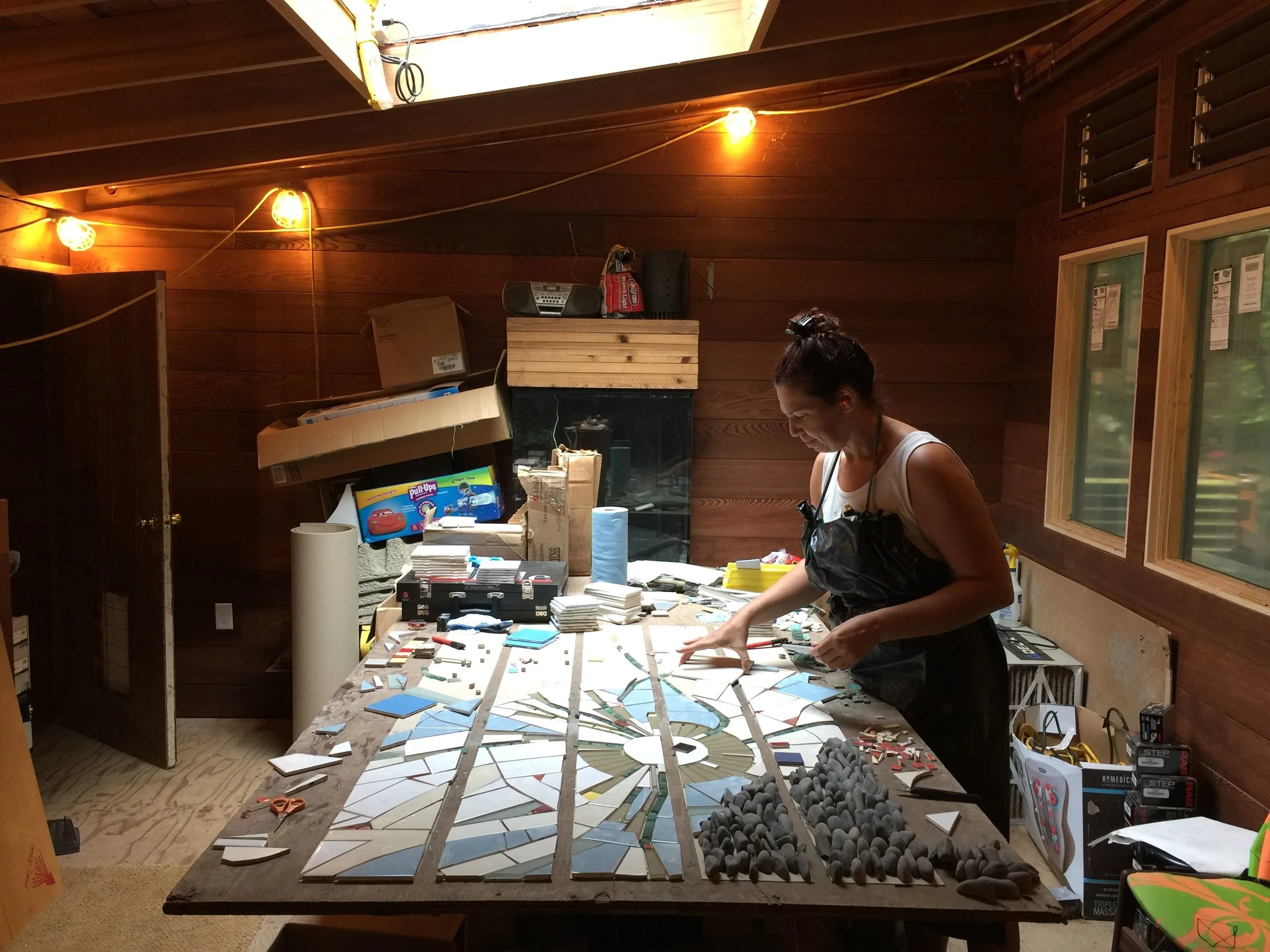 Below: Maya takes reclaimed ceramic tiles from outdated architectural sample libraries and creates biophilic elements throughout the house. This stair set mural tells a story about "seeds of change" and suggests the seeds of a dandelion being blown in the wind. The dandelion is the icon of the International Living Future Institute. This project is a seed that landed in Palolo Valley and will inspire other projects to take action.